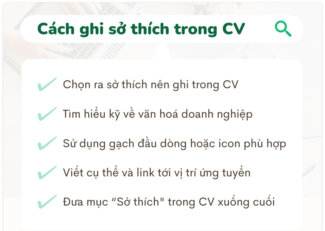 Chỉ nên đưa ra các sở thích khi chúng có liên quan đến công việc dự tuyển hoặc phù hợp với đối tượng xem lý lịch. Ví dụ một kỹ thuật viên máy tính thì có thể chia sẻ rằng anh ấy thích sửa chữa những chiếc xe cũ, hoặc một người tổ chức sự kiện thì nên đề cập đến kinh nghiệm tham gia sinh hoạt trên sân khấu hay nhà văn hoá.